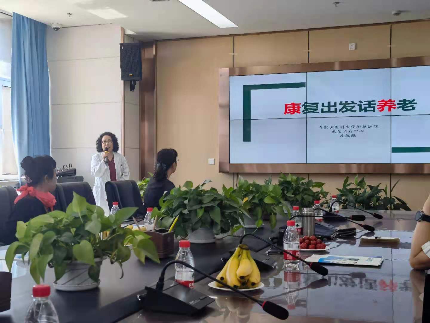 讲座中,内蒙古医科大学附属医院康复治疗中心主任医师南海鸥老师从康复出发话养老,针对老年人的不同特点,从生理性养老、科学养老、康养结合、谨慎用药、合理饮食、娱乐活动等方面进行讲解,提醒大家养成健康习惯,提高身体素质。