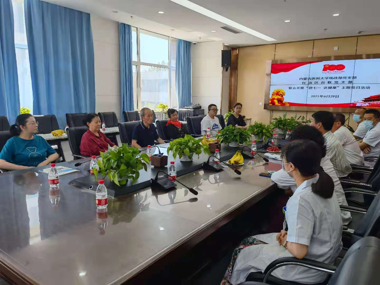 为进一步提高党员干部的党性修养,坚定理想信念,弘扬爱国主义奋斗精神,推进党史学习教育,同时将“我为群众办实事”活动落到实处,2021年6月29日,在新华校区综合实验楼410会议室,内蒙古医科大学党委统战部与自治区台联联合开展“迎七一,送健康”主题党日活动。参加此次主题党日活动的还有附属医院中医科、口腔科、耳鼻喉科、康复科组成的专家组以及十余位老台胞,为他们开展医疗讲座和现场义诊。