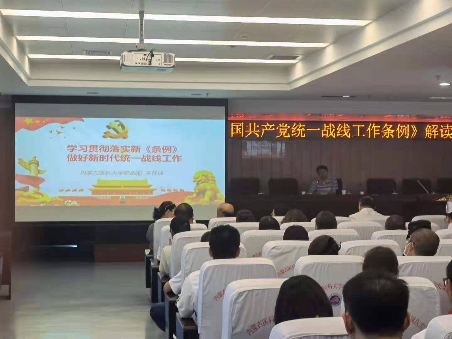 7月9日下午,在附属医院门诊病房楼8楼视频会议室,学校党委统战部举办了全校党外人士学习贯彻《中国共产党统一战线工作条例》(以下简称条例)专题辅导讲座,各民主党派成员、无党派人士代表100余人参加会议。会议由学校党委委员、统战部部长李存保做专题辅导。
