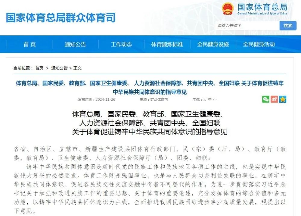 近日,国家体育总局、国家民委、教育部、国家卫生健康委、人力资源社会保障部、共青团中央、全国妇联联合发布《关于体育促进铸牢中华民族共同体意识的指导意见》。